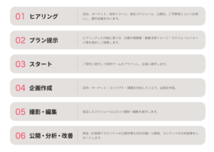 TikTok運用に必要な企画立案・撮影編集・投稿・効果検証までをワンストップでご提供。運用の全てをサポートいたします。
